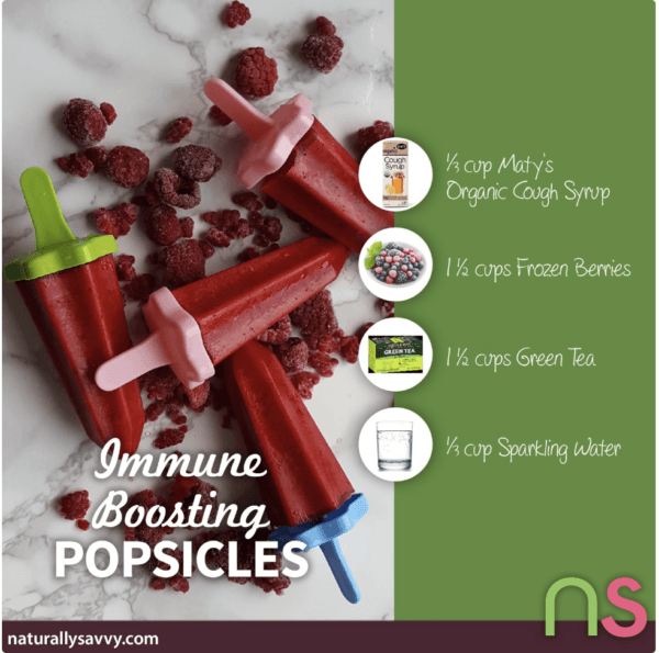 These popsicles are a refreshing summer treat or great to keep on hand when those germs start getting passed around. So what is the secret immune boosting ingredient, Maty’s Organic Cough Syrup. It tastes delicious straight from the bottle but is a healthy swap for added sugar. Each ingredient in the cough syrup is chosen for it’s immune boosting benefits and include organic cinnamon, apple cider vinegar, zinc, and lemon peel. Simple add your favorite fruit, or berries and enjoy. To your health!