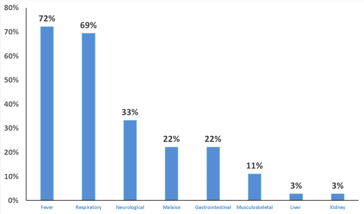 Patients reported respiratory symptoms, fever, coughing, dyspnea or breathing difficulties, and/or neurological and gastrointestinal symptoms.
