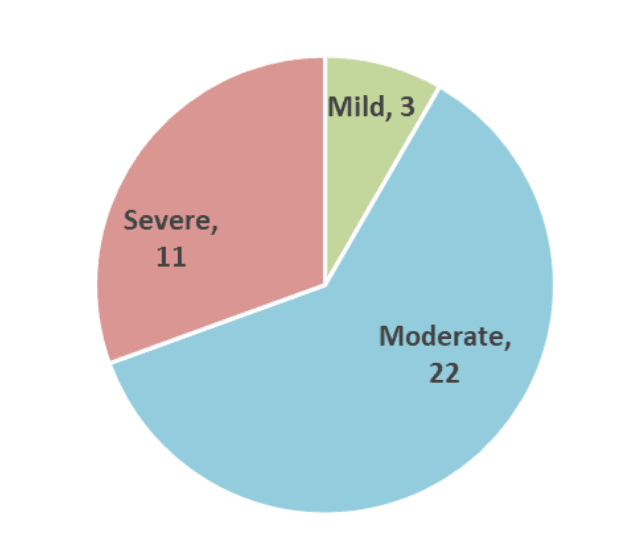 Symptoms range from mild, moderate to severe. The vast majority (91%) of patients had moderate or severe symptoms.