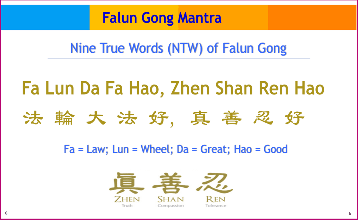 The nine true words refers to nine Chinese characters: “Fa-Lun Da-Fa Hao” and “Zhen-Shan-Ren Hao” (法輪大法好, 真善忍好) (Audio link, song link).