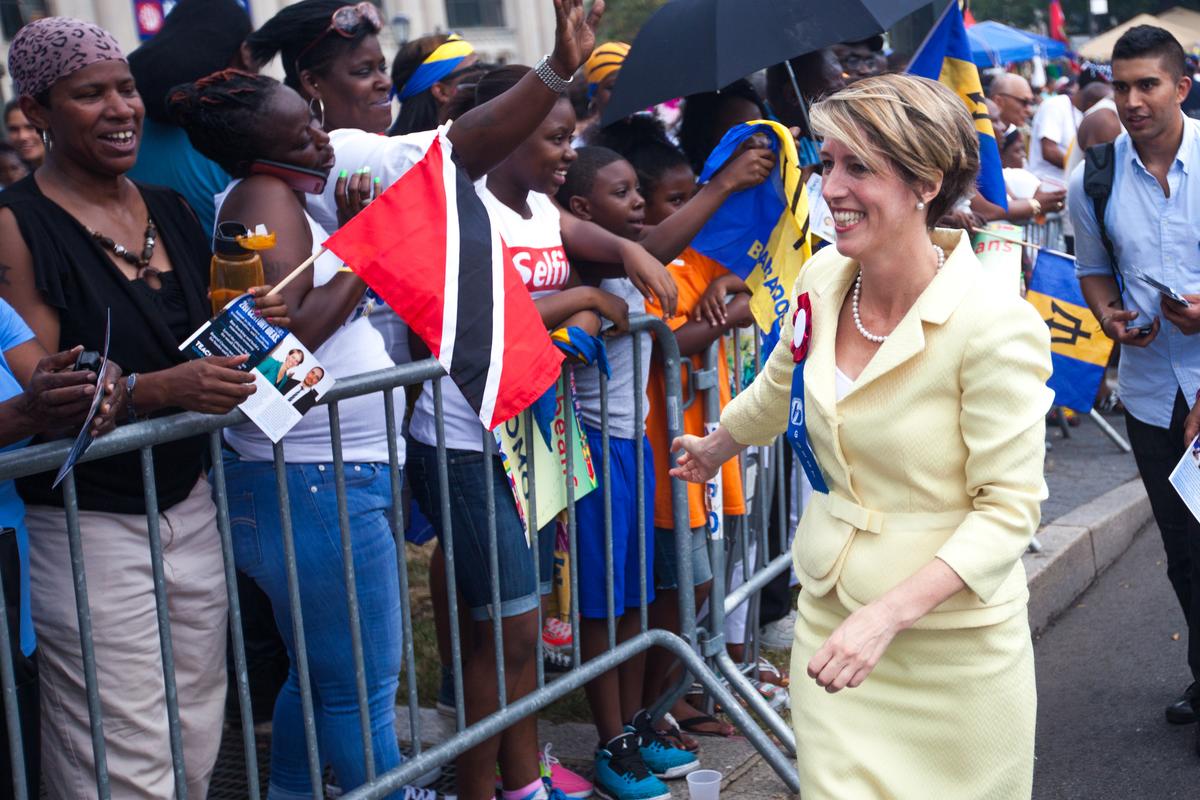 Zephyr Teachout, running against Andrew Cuomo for the Democratic Party nomination for Governor of New York, greets onlookers at the West Indian Day Carnival Parade along Eastern Parkway in Brooklyn, New York, Sept. 1, 2014. (Petr Svab/Epoch Times)