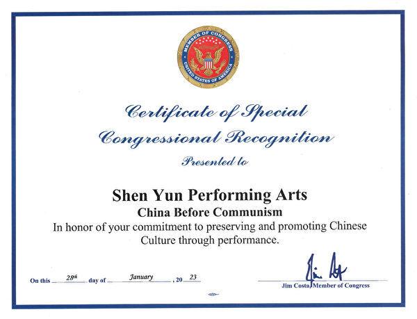 To commend this effort, Congressman Jim Costa presented Shen Yun with a Certificate of Special Congressional Recognition on Jan. 28, for their commitment to “preserving and promoting Chinese Culture through performance.”