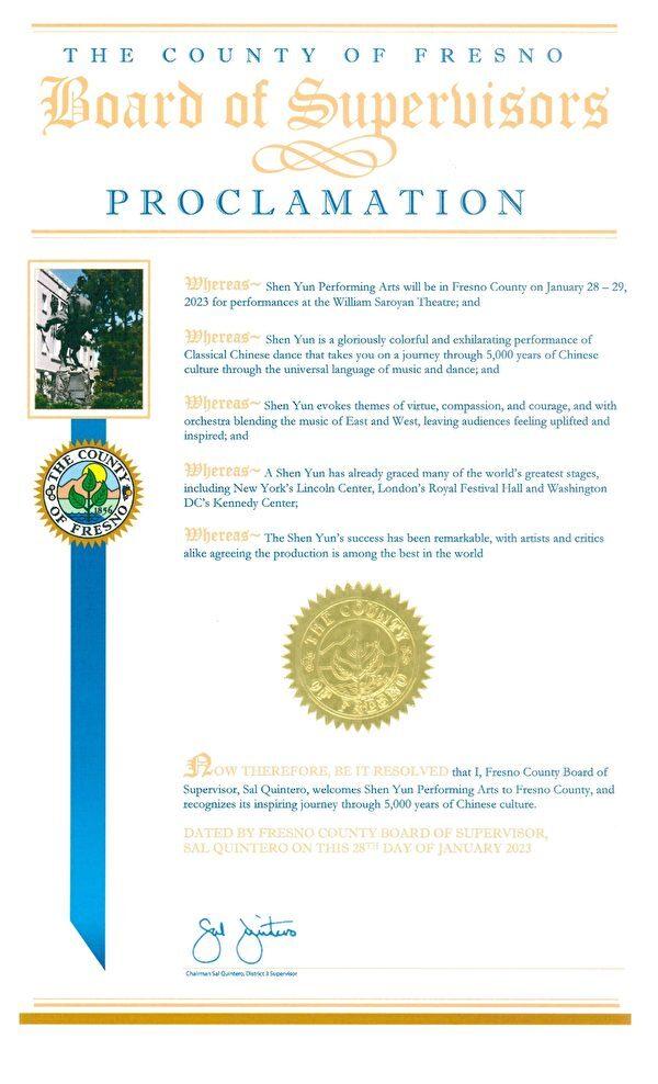 Sal Quintero, the chairman of Fresno County’s board of supervisors, issued a proclamation stating that “Shen Yun is a gloriously colorful and exhilarating performance” that “evokes themes of virtue, compassion, and courage, and with orchestra blending the music of East and West, leaves audiences feeling uplifted and inspired.”
