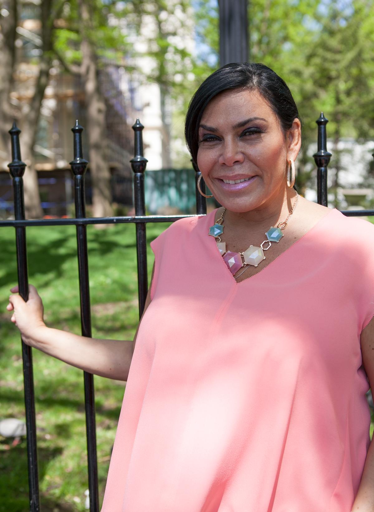 Celebrity life coach Karen Hoyos at the Manhattan entrance of the Brooklyn Bridge for the third annual Milagros Day Mother’s Day walk, May 11, 2014. (Samira Bouaou/Epoch Times)