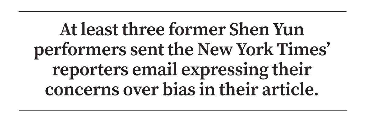 At least two other former Shen Yun performers sent the reporters emails expressing concern over bias.