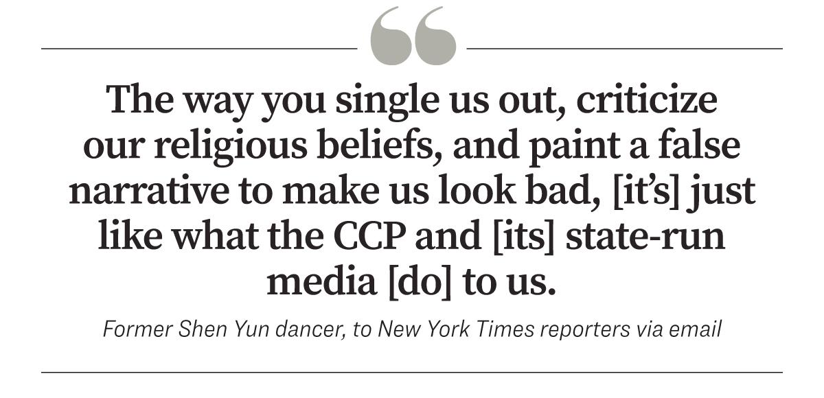 “The way you single us out, criticize our religious beliefs, and paint a false narrative to make us look bad, [it’s] just like what the CCP and [its] state-run media [do] to us,” one former Shen Yun dancer wrote in an email to the reporters.