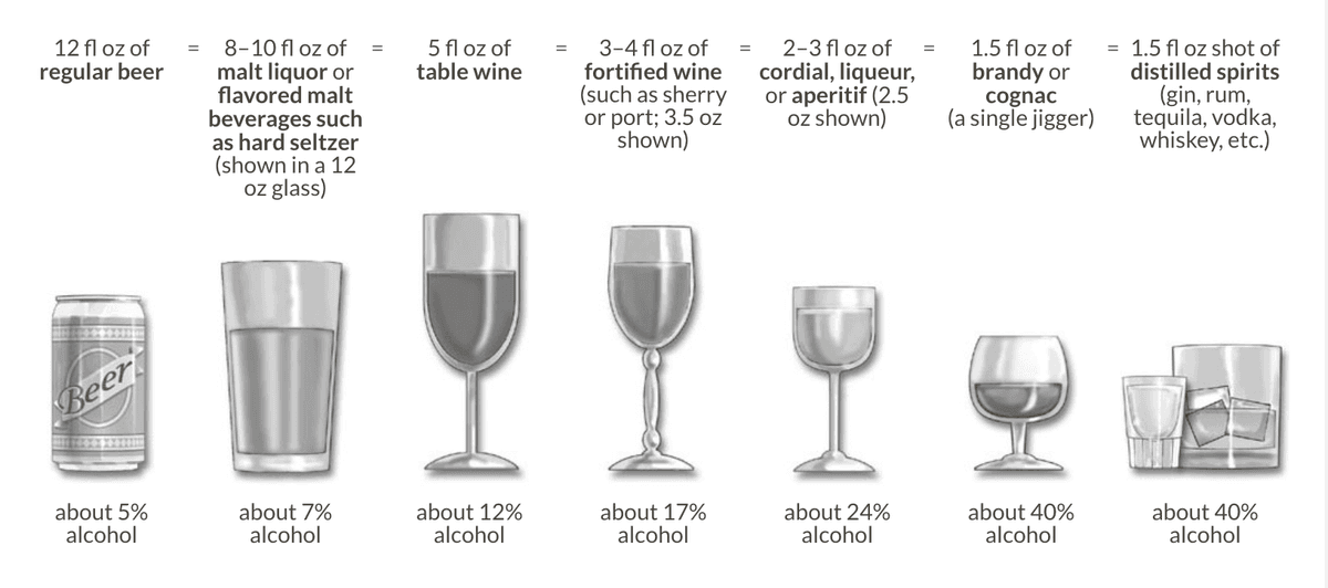 In the United States, a “standard drink” (also known as an alcoholic drink equivalent) is defined as any drink that contains about 0.6 fluid ounces or 14 grams of pure alcohol. Although the drinks pictured here are different sizes, each contains approximately the same amount of alcohol and counts as one U.S. standard drink or one alcoholic drink equivalent.