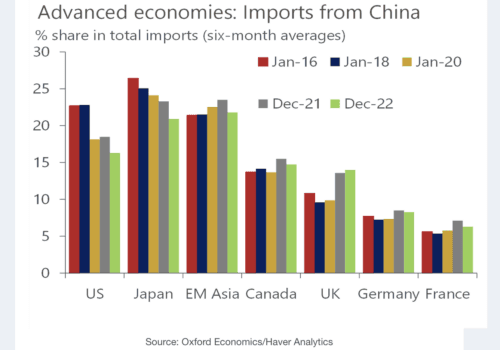 An OE chart of imports from China by advanced economies shows a notable drop from 2016 to 2022 by the United States and Japan, while Canada, among others, has either stayed level or gone up.