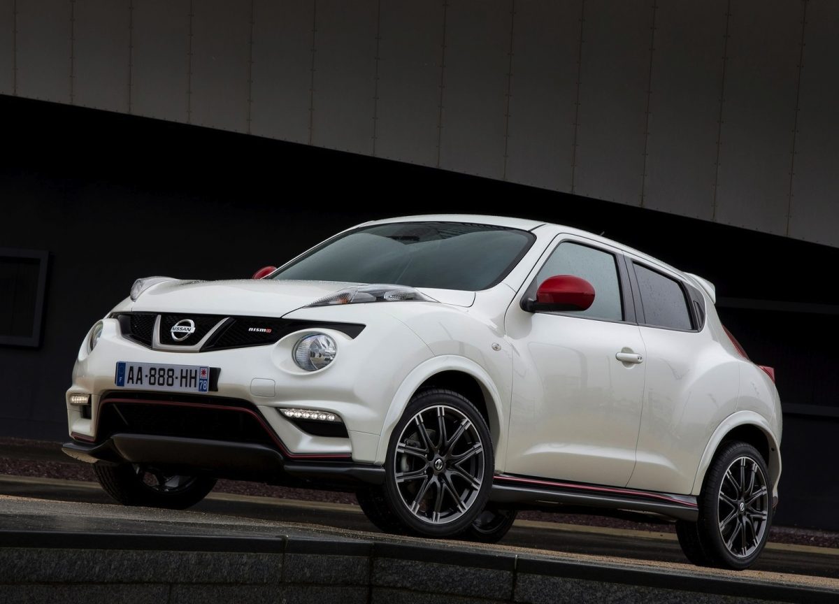 It has an extra dose of road-holding ability over the standard version thanks to a lower ride height and 10 percent stiffer springs, and it has a special body kit that includes a heavily contoured airdam, deep side skirts and a new rear fascia and wing. The most interesting feature, however, is red side mirrors that really stand out on a white Juke.