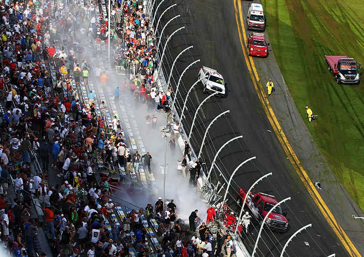 Fourteen injured fans were treated on-site; seven more were sent to the Halifax Medical Center on the Speedway grounds, and six went to Halifax Health Center in Port Orange. All of these were in stable condition as of 7 p.m., according to NASCAR.com.