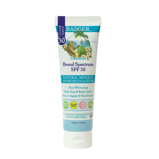 The newly formulated Badger SPF 30 Clear Zinc Sunscreen Lotion is a lightweight, easy-to-apply, non-greasy sunscreen lotion. It blocks the sun’s harmful rays with clear zinc oxide, a specialized zinc oxide powder with high transparency and low whitening. A gentle base of aloe and sunflower oil makes it ideal for sensitive skin. Lab-approved hypoallergenic and noncomedogenic, it won’t clog pores.