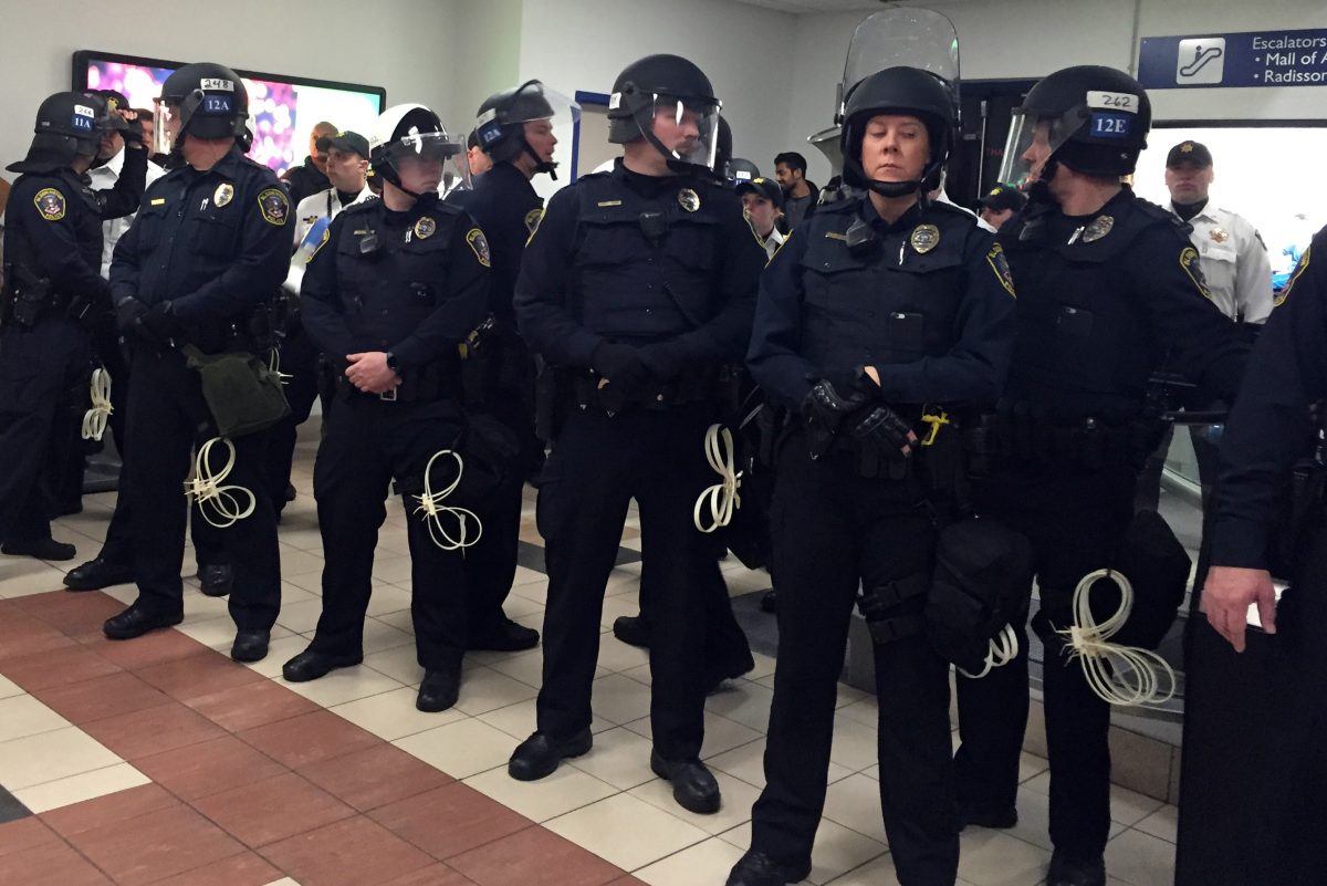 About 500 protesters briefly gathered at the mall before abruptly walking out while chanting, “What do we want? Justice! When do we want it? Now!” The crowd then headed to the light-rail station and onto the airport.