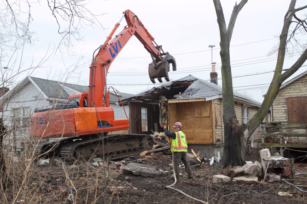 First the garage was flattened. Next, the chimney of the house was ripped down and smashed. Then the back door and back wall of the one-story bungalow came off and the shingled roof was stacked atop the growing pile of wood and cement.