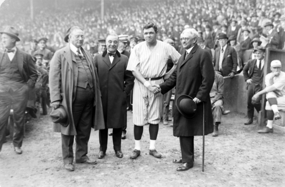 New York Yankees' owners, from left to right, Col. Tillinghast LHommedieu Huston and Jacob Ruppert appear with Babe Ruth and Gov. Nathan L. Miller of New York, Oct. 6, 1921. AP Photo