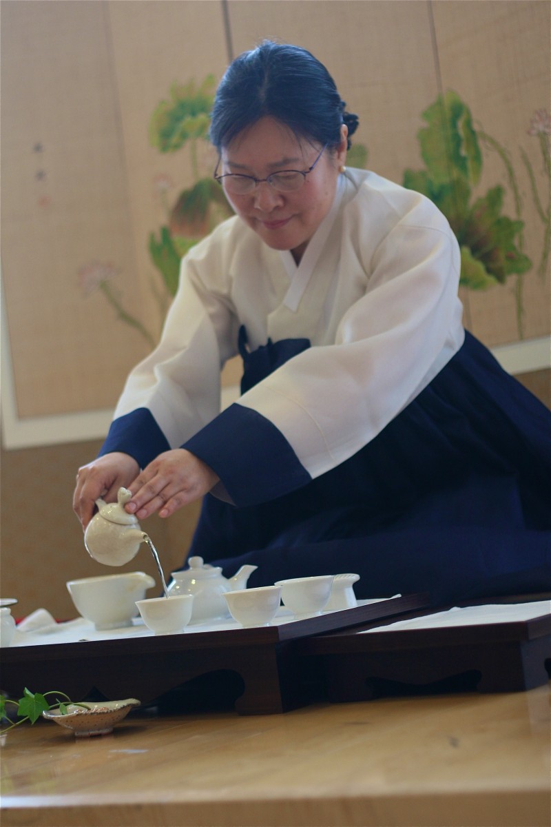 A crowd gathers and stays to watch a traditional Korean tea ceremony. The slow, methodical event has been carried down for centuries and is still used in Korea today to honour dignitaries like foreign presidents and important investors.
