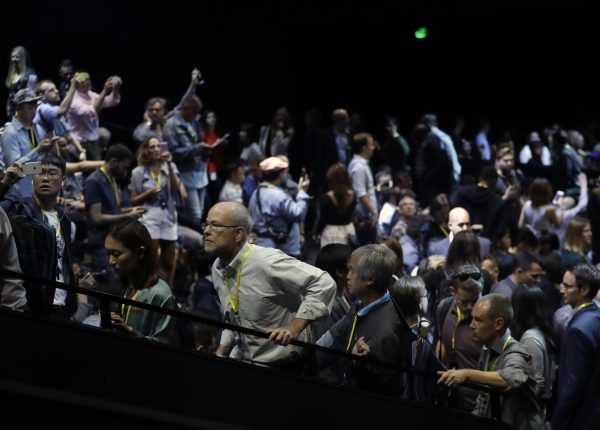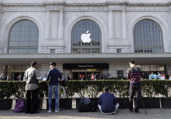 People wait to enter the auditorium before an event to announce new Apple products, Wednesday, Sept. 7, 2016, in San Francisco. (AP Photo/Marcio Jose Sanchez)