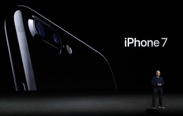 Apple CEO Tim Cook announces the new iPhone 7 during an event to announce new products Wednesday, Sept. 7, 2016, in San Francisco. (AP Photo/Marcio Jose Sanchez)
