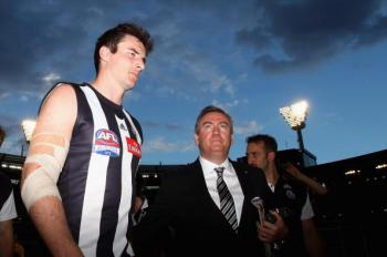 Darren Jolly and Eddie Maguire the president of the Magpies leave the ground after the game was a draw during the AFL Grand Final match. Quinn Rooney/Getty Images