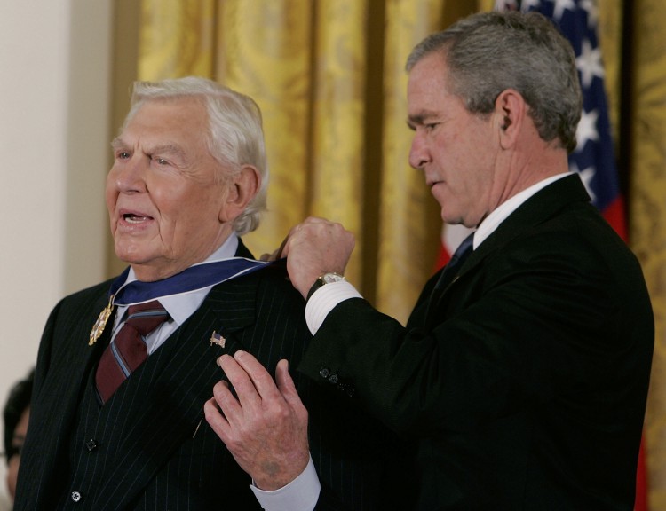 Actor Andy Griffith recieves the Medal of Freedom from U.S. President George W. Bush during a ceremony at the White House November 9, 2005 in Washington DC. Photo by Mark Wilson/Getty Images