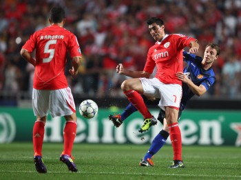 Jonny Evans (far right) of Manchester United challenges Oscar Cardozo of SL Benfica during their UEFA Champions League Group C match on Sept. 14 in Lisbon, Portugal. Clive Mason/Getty Images