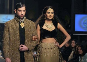 REGAL COUPLE: Models display creations by Pakistani designer Hassan Sheheryar Yasin on the last day of Bridal Couture Week 2010 in Lahore on Nov 28. Arif Ali/AFP/Getty Images
