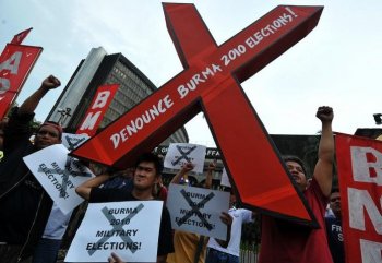 Members of the Free Burma Coalition stage a protest in front of the Department of Foreign Affairs in Manila, Philippines, on Oct. 22, to show their support to Burma activists calling to boycott the Nov. 7 elections, the country's first in 20 years.  (Noel Celis/Getty Images)