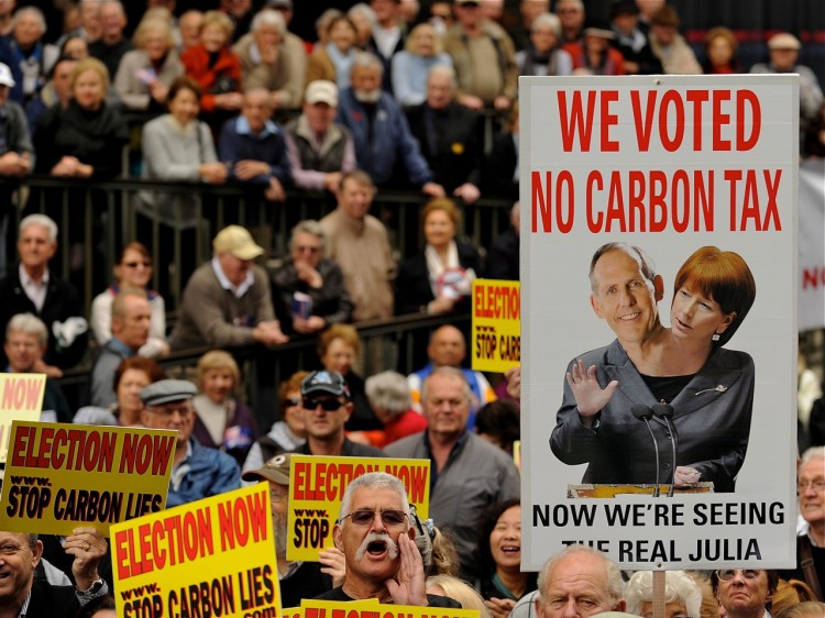 Protesters hold placards during a rally in Sydney on July 1, 2011 against Australian Prime Minister Julia Gillard's plans to introduce a carbon tax. Greg Wood/AFP/Getty Images
