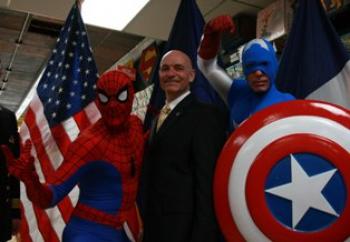 NEW YORK—Holy stop, drop, and roll Batman! That’s what Robin might have said if he were at Midtown Comics near Times Square on Tuesday. Fire Commissioner Salvatore J. Cassano handed out a comic book featuring fire-starting foes and fire-fighting heroes—a not so diabolical ploy to teach kids about fire safety.