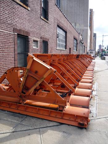 SHOVELS: Snow shovels sit outside of the NYC Department of Sanitation’s garage on the west side of Manhattan. The Department needs a new place to store salt for snowy months, and TriBeCa residents are leery of their plans for a shed that will hold 5,000 Christine Lin/Epoch Times