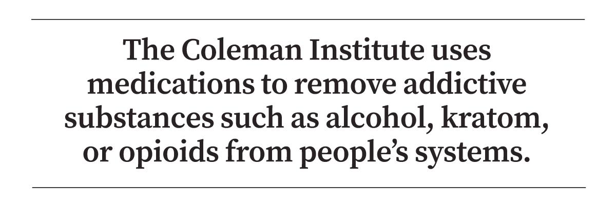 Using a protocol that the clinic’s founder, Dr. Peter Coleman, spent years developing, the institute uses medications to remove addictive substances such as alcohol, kratom, and opioids from people’s systems.