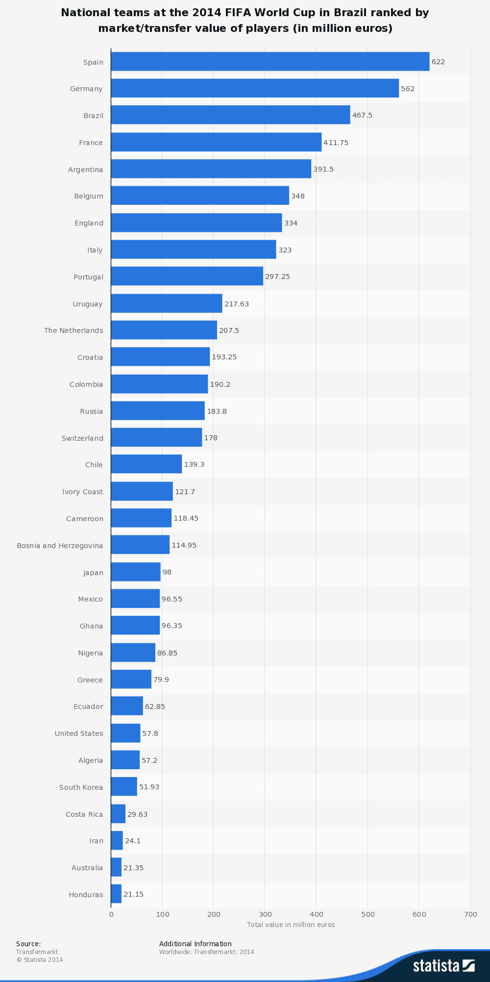 Now just under a week before FIFA World Cup 2014 officially kicks off, the pundits have already named their top picks. However, what do the numbers have to say? In regards to this, the statistics portal ‘Statista’ has released data ranking both the participating countries, and the top 25 individual players by market value.