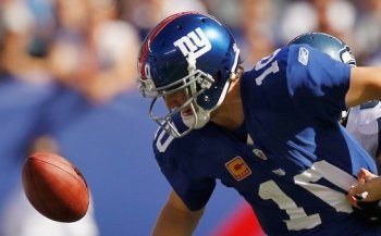 Eli Manning coughs up the ball in the first quarter, on a sack by defensive end Chris Clemons. Two plays later Seahawks running back Marshawn Lynch fumbled the ball back to New York. (Mike Stobe/Getty Images)
