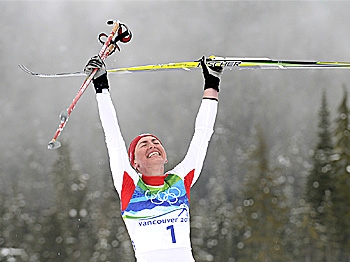 Poland's Justyna Kowalczyk rejoices after winning the women's Cross Country skiing 30 km mass start classic during the Vancouver Winter Olympics. Javier Soriano/AFP/Getty Images