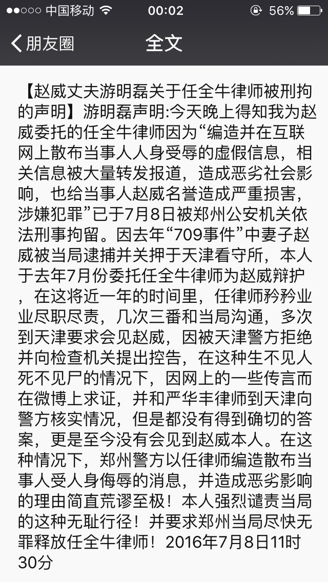 He vented his anger on WeChat, a popular Chinese social media service. “Over the last year lawyer Ren has been conscientiously and diligently communicating with authorities, and has repeatedly asked to meet with Zhao Wei,” he said.
