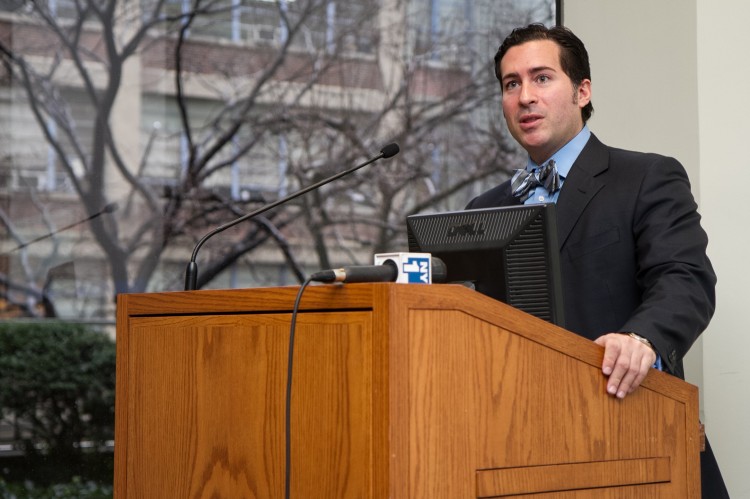Andrew Dean (R) of the winning University at Buffalo Law School team, speaks about their district map at Fordham University on Tuesday while other team members look on. Benjamin Chasteen/The Epoch Times
