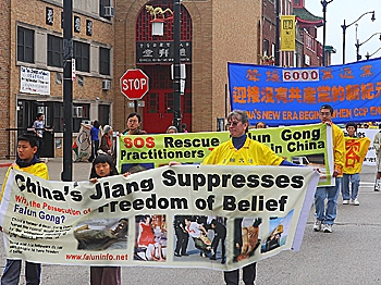 Practitioners and supporters of Falun Gong march through Chicago, telling about the practice and the persecution by the Chinese communist regime. (Gary Du/The Epoch Times)