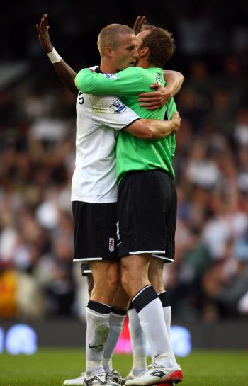 RELIEF! Fulham's Brede Hangeland (left) hugs is goalkeeper Mark Schwarzer after his team hung on to upset Arsenal. (Jamie McDonald/Getty Images)