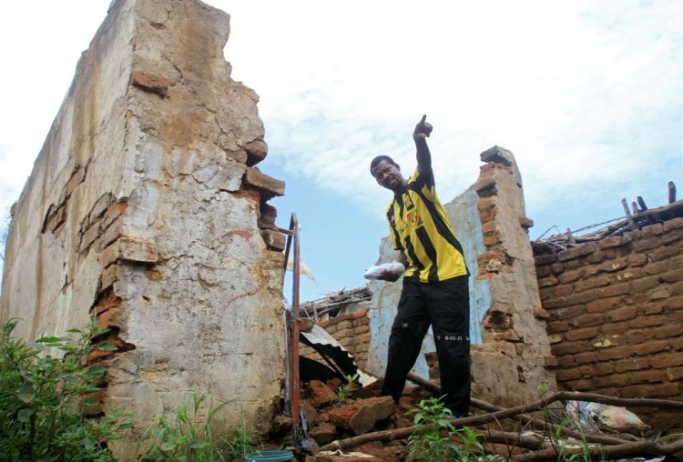 A Sudanese man points to damages caused by fighting that erupted in June between government forces and ex-rebels with strong ties to South Sudan, in Kadugli in the tense border region of South Kordofan on Oct. 21. ASHRAF SHAZLY/AFP/Getty Images