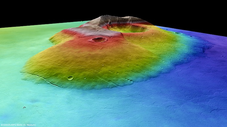 These images were created using data from the High Resolution Stereo Camera on the European Space Agency’s Mars Express spacecraft. The data is color coded with beige representing the highest regions and purple the lowest.