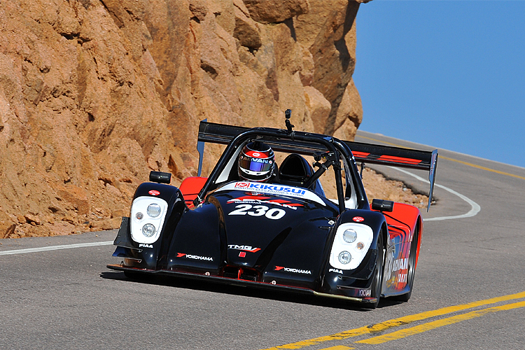 The car, a modified Radical sports car chassis, is fitted with a pair of electric motors generating 350 kilowatts or 469 horsepower, enabling it to hit 150 mph when geared for the Pike’s Peak climb.