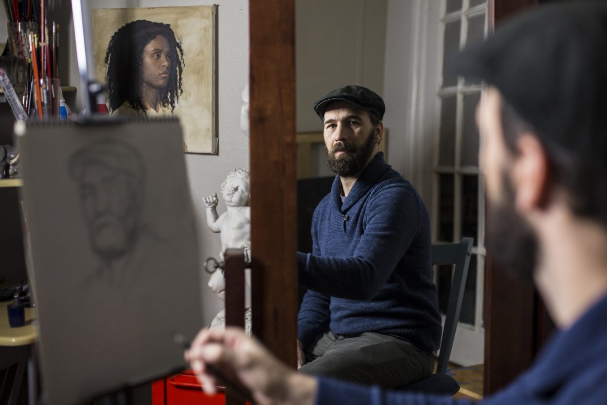 As a stay-at-home dad and full-time painter, taking care of his young children during the day and painting in the evenings until around 3 a.m., he doesn’t have much time to wallow in fears of how to surpass his biggest artistic accomplishment so far. Perhaps these do come through in the ongoing series of work that he returns to between other projects and commissions—creating self portraits.