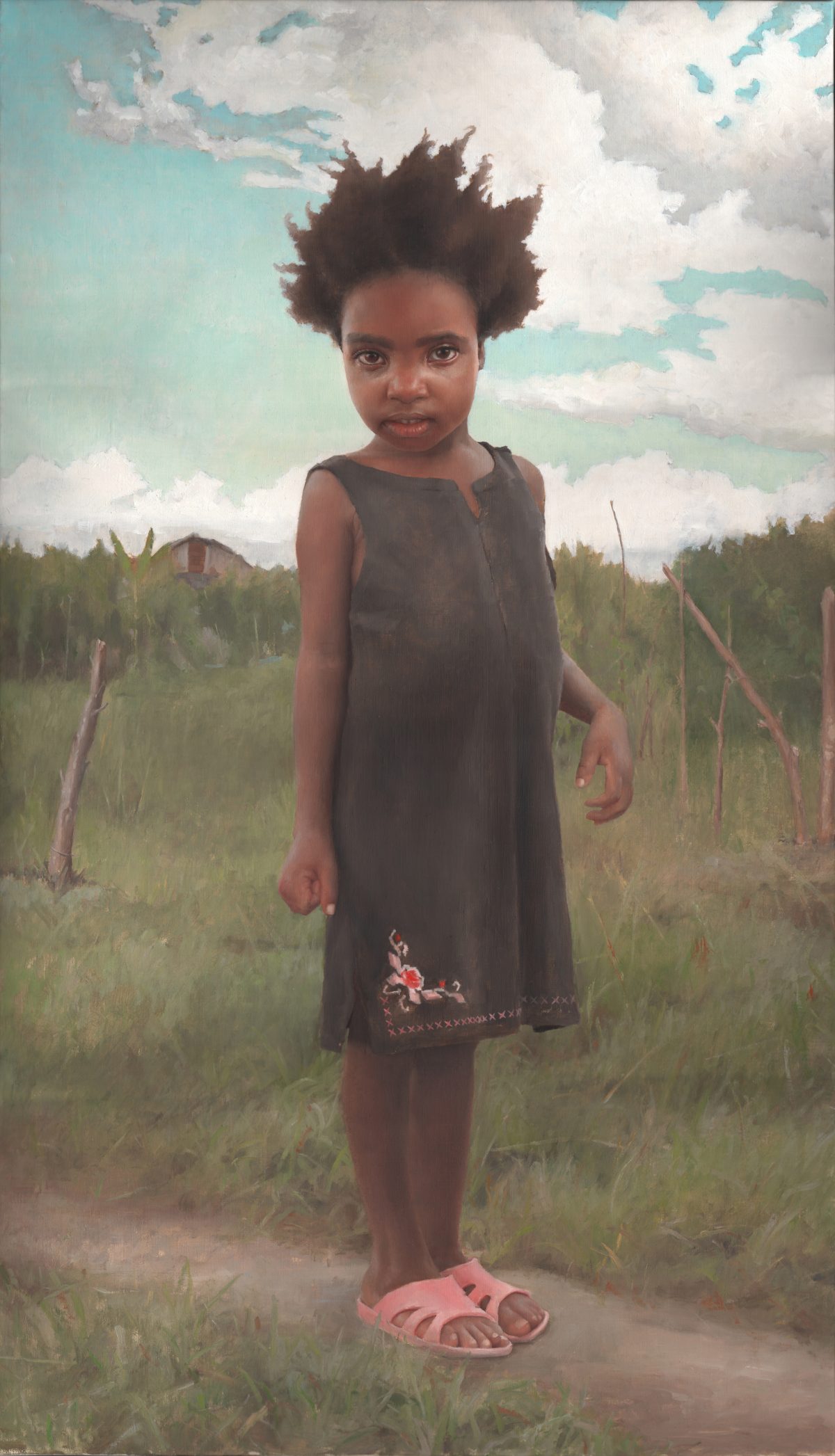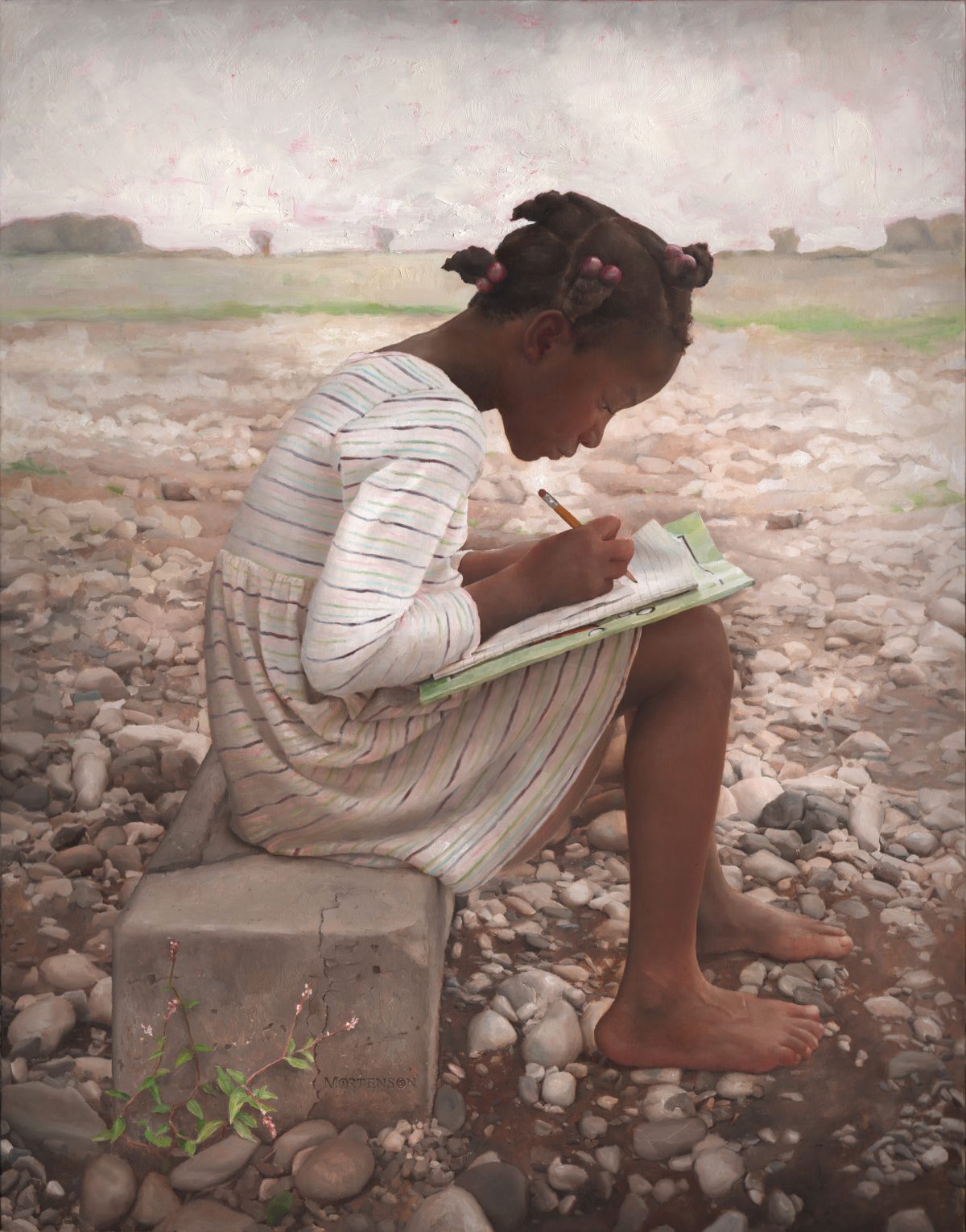 One of the most telling paintings of the series shows a 9-year-old girl named Venice sitting on a block of concrete. She concentrates on doing her homework, with her bare feet on earth and pebbles. This description sounds rather bleak, but the painting itself is uplifting, beautiful, and serene.