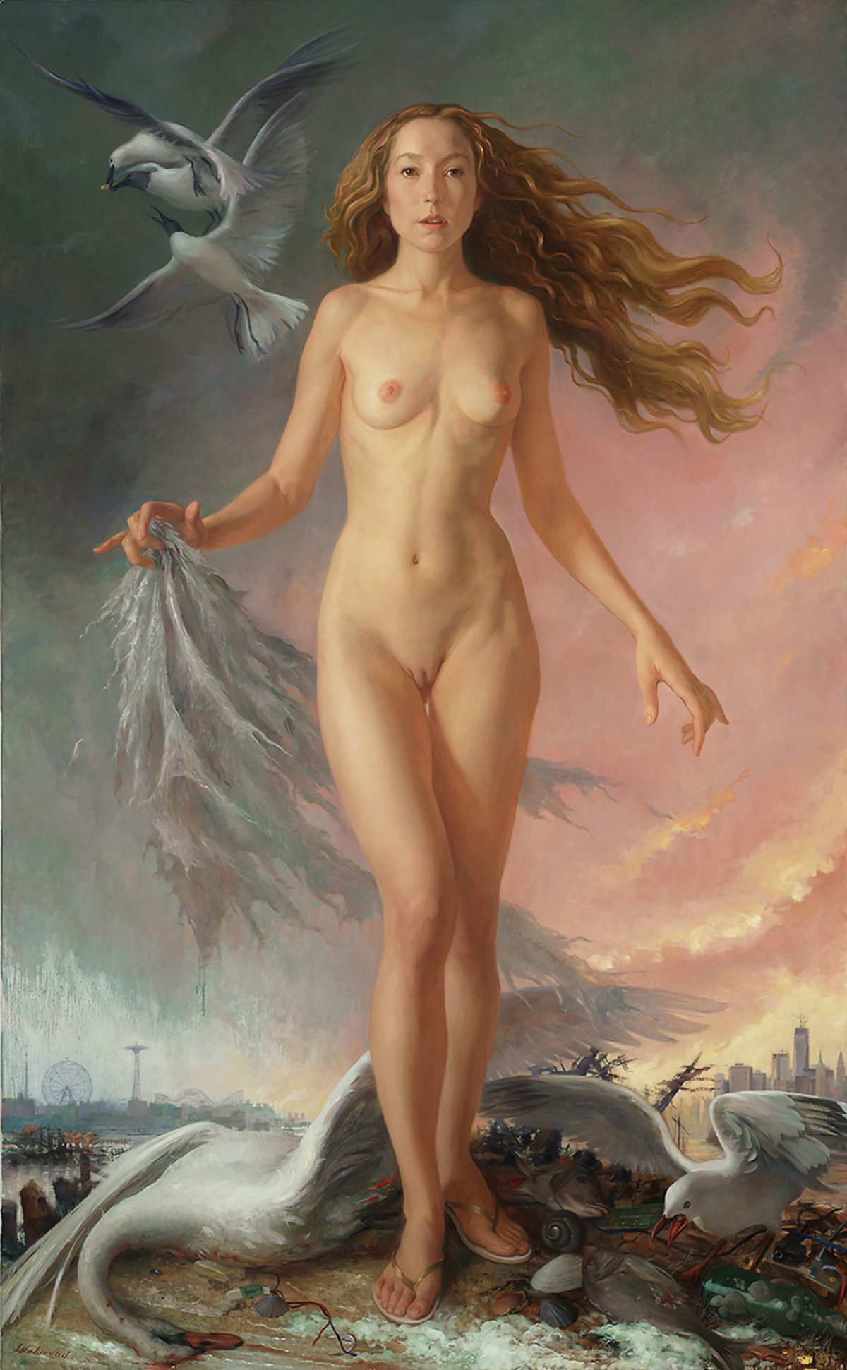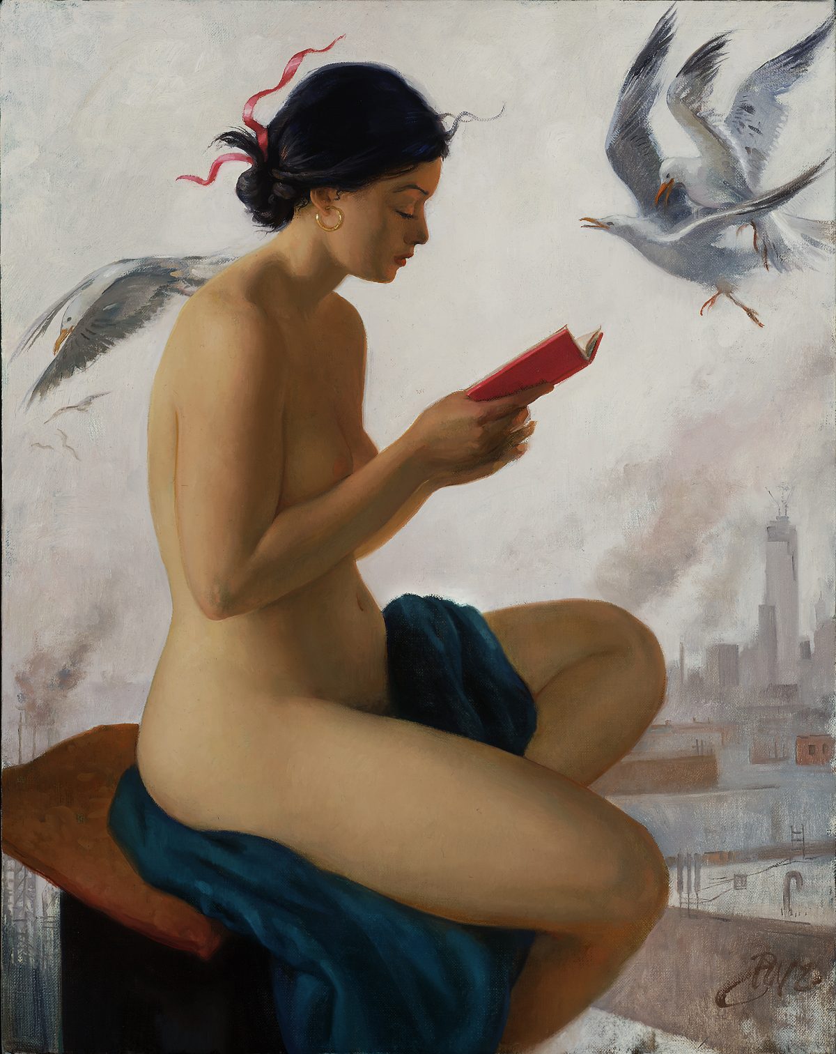 NEW YORK—A woman sitting on a rock by the sea reads a royal blue book. A pink stole draped over her knee swirls up around her nude figure. She maintains a wonderfully serene, self-contained expression. Hinting at the use of earth’s resources, the stole, as it flows past the small of her back, frames an oil platform in the distant background, in Patricia Watwood’s painting “Pink Sibyl.”