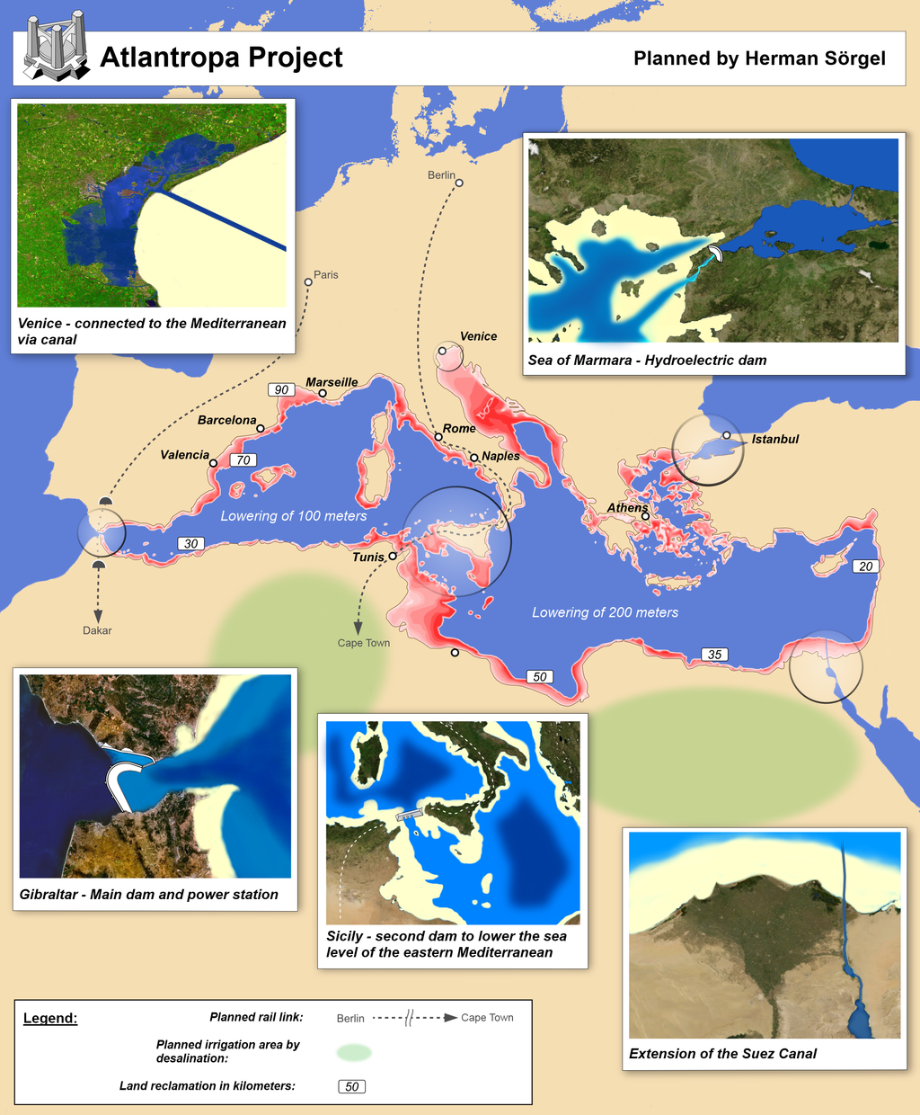 Dams across the Strait of Gibraltar, the Dardanelles, and eventually between Sicily and Tunisia, each containing gigantic hydroelectric power plants, would form the basis for the new supercontinent. In its final state the Mediterranean would be converted into two basins, with the western part lowered by 100 meters and the eastern part by 200 meters and a total of 660,200 km2 of new land reclaimed from the sea—an area larger than France.