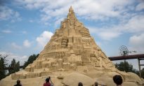 Visitors stand near the Sandburg sandcastle in Duisburg, Germany, on Sept. 1, 2017. A local travel agency commissioned ...