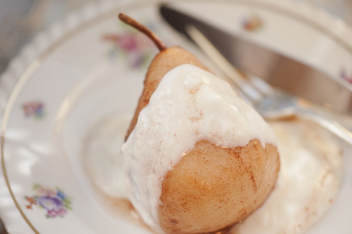 This healthy baked pear recipe is flavoured by the natural sweetness of the fruit. it is a simple yet elegant dessert. Apples can be used instead of pears.