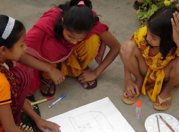 For the last six months Sweety, Farza, and Yasmin have been inductee botanists: watering plants, pruning, documenting, and seeding them. Now the three are preparing New Year cards using plant leaves, and sending them to their far-flung friends.