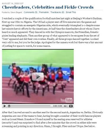 If you want to get some laughter – here is a good one from The Time blogger. The Chinese cheerleaders really got him rolling.