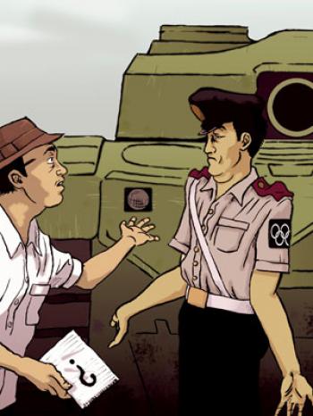 “Why is there a tank outside the press centre?” asks a confused journalist.