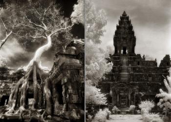 ANCIENT:(L)Photographer McDermott captured a twisted tree at the temple site Ta Prohm, which is part of the archeological site Angkor, in Cambodia.(R)TEMPLE MOUNTAIN: Bakong is an early temple mountain constructed by rulers of the Khmer Empire in the 9th century. The photograph is taken in infrared to contrast the foliage of the trees to the stone ruins.Courtesy of Sundaram Tagore Galleries